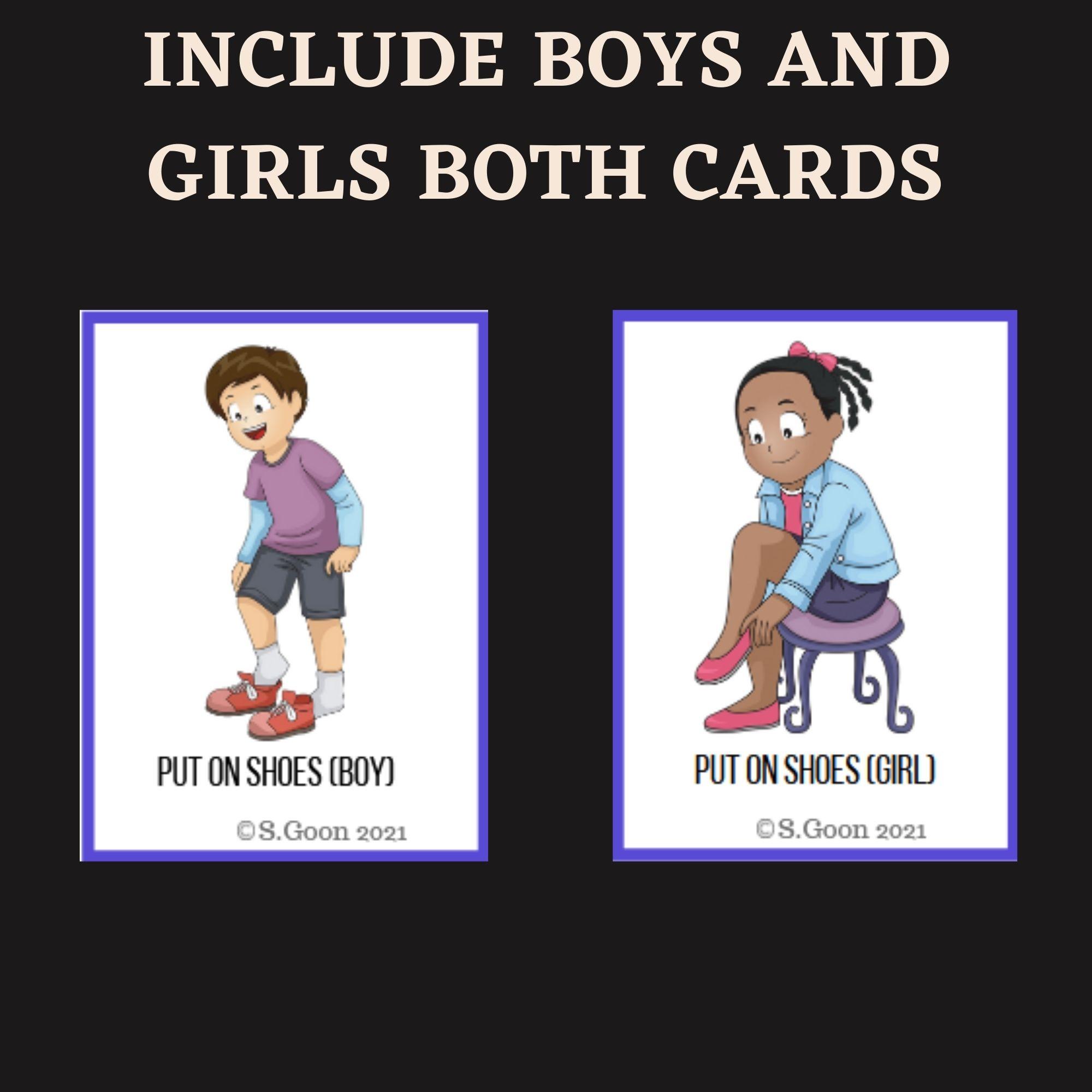 put on pajamas, pack backpack(boy), pack backpack(girl), put on shoes(girl), put on shoes(boy), put on shirt, put on jacket, circle time, jumping, exercise(boy), exercise(girl), swing(girl), swing(boy), nap time(girl), nap time(boy), ot, speech, calendar, art, watching tv, cycling(girl), cycling(boy), play time,take medicine, floss teeth (girl), floss teeth(boy), wash hair, potty(boy) potty(girl), change clothes, haircut(boy), haircut(girl), go for a walk, watching mobile(girl), watching mobile(boy), ride bus, computer time(girl), computer time(boy), snack, play outside, set table, park, playground, car ride, shopping, grocery, stop, start, doctor visit, face wash(boy), face wash(girl), play dough work, wait, help, toilet, throw away, clean.