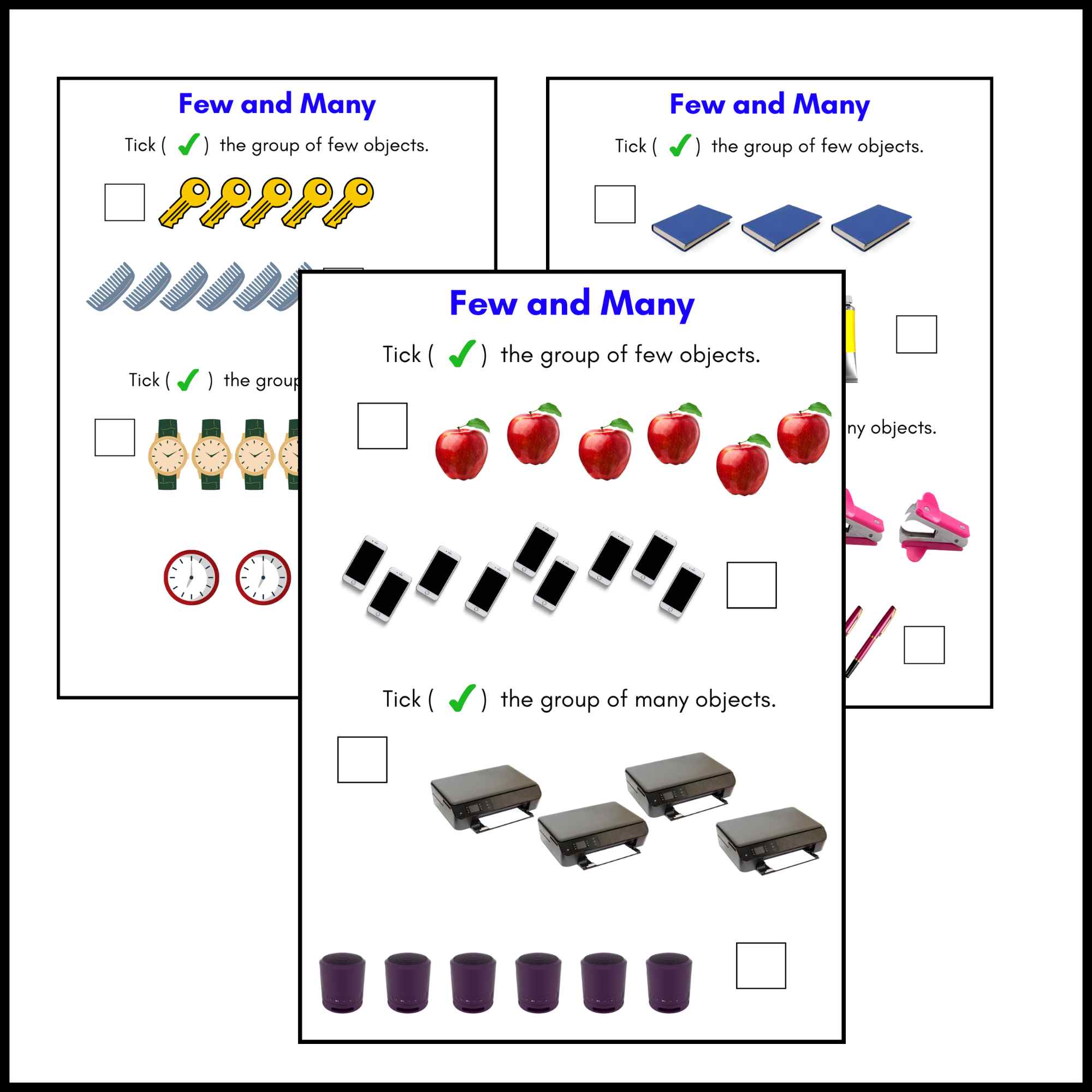 • Engaging activities like circle the correct group, cut and paste, color the few/many objects