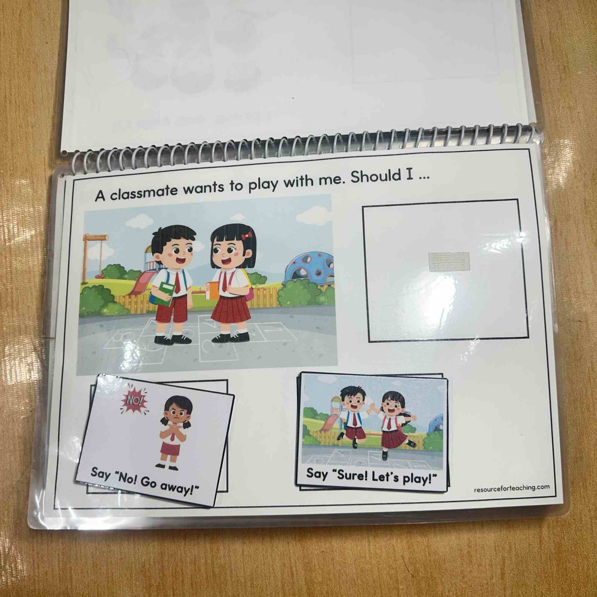 This laminated book includes 15 durable pages, each featuring a relatable school scenario such as sharing with a friend, shouting in class, following directions, or refusing to do work. Each page displays a visual situation, and students must choose the correct response using 2 Velcro answer cards labeled “Good Behaviour” and “Bad Behaviour.” These cards help reinforce positive behavior choices while allowing students to reflect on the consequences of negative behavior.