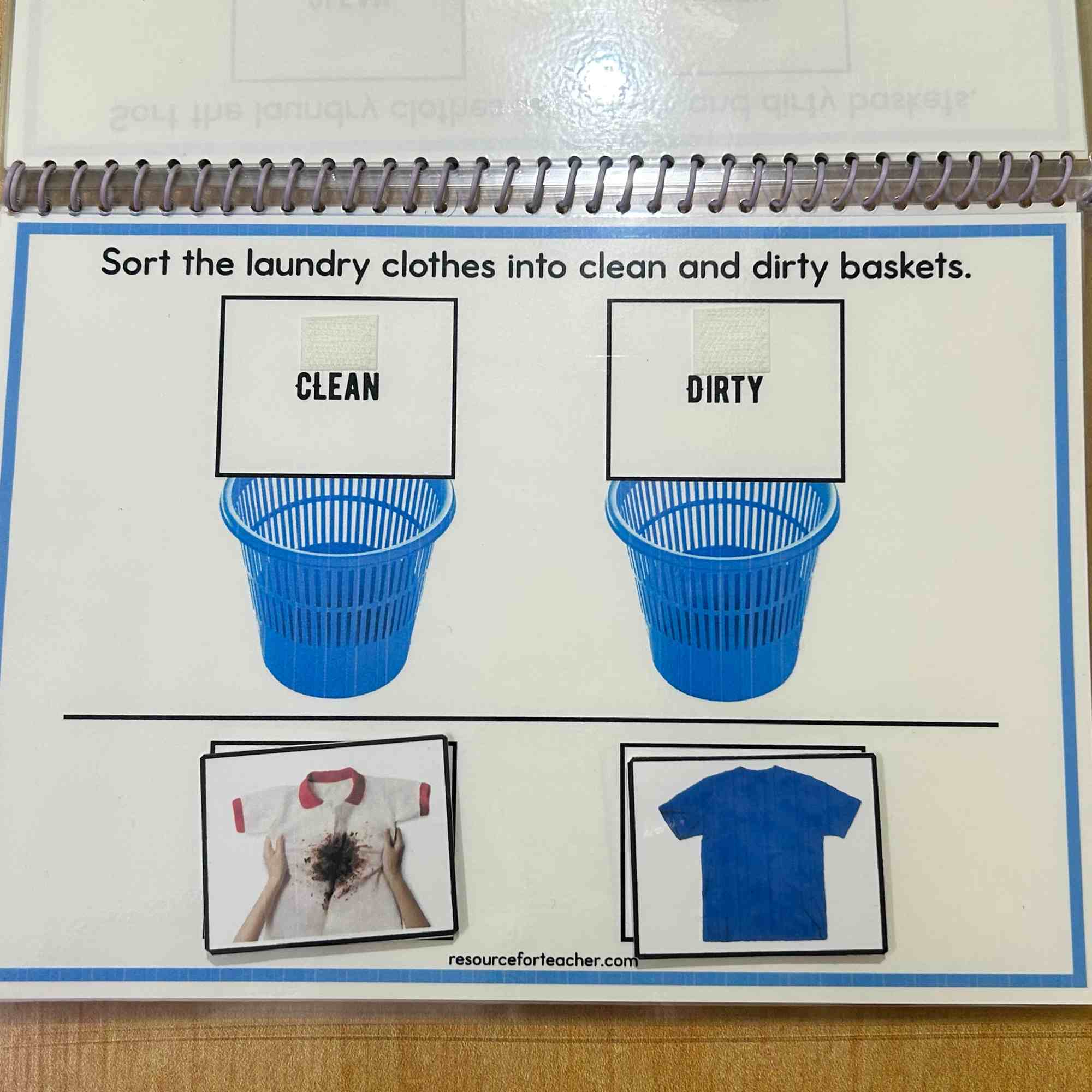 - Interactive Sorting Baskets: Each page features 2 illustrated sorting baskets, labeled “Clean” and “Dirty,” prompting correct categorization.