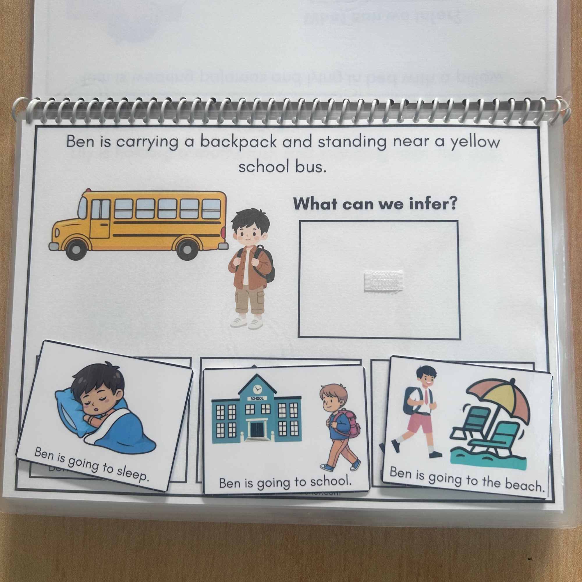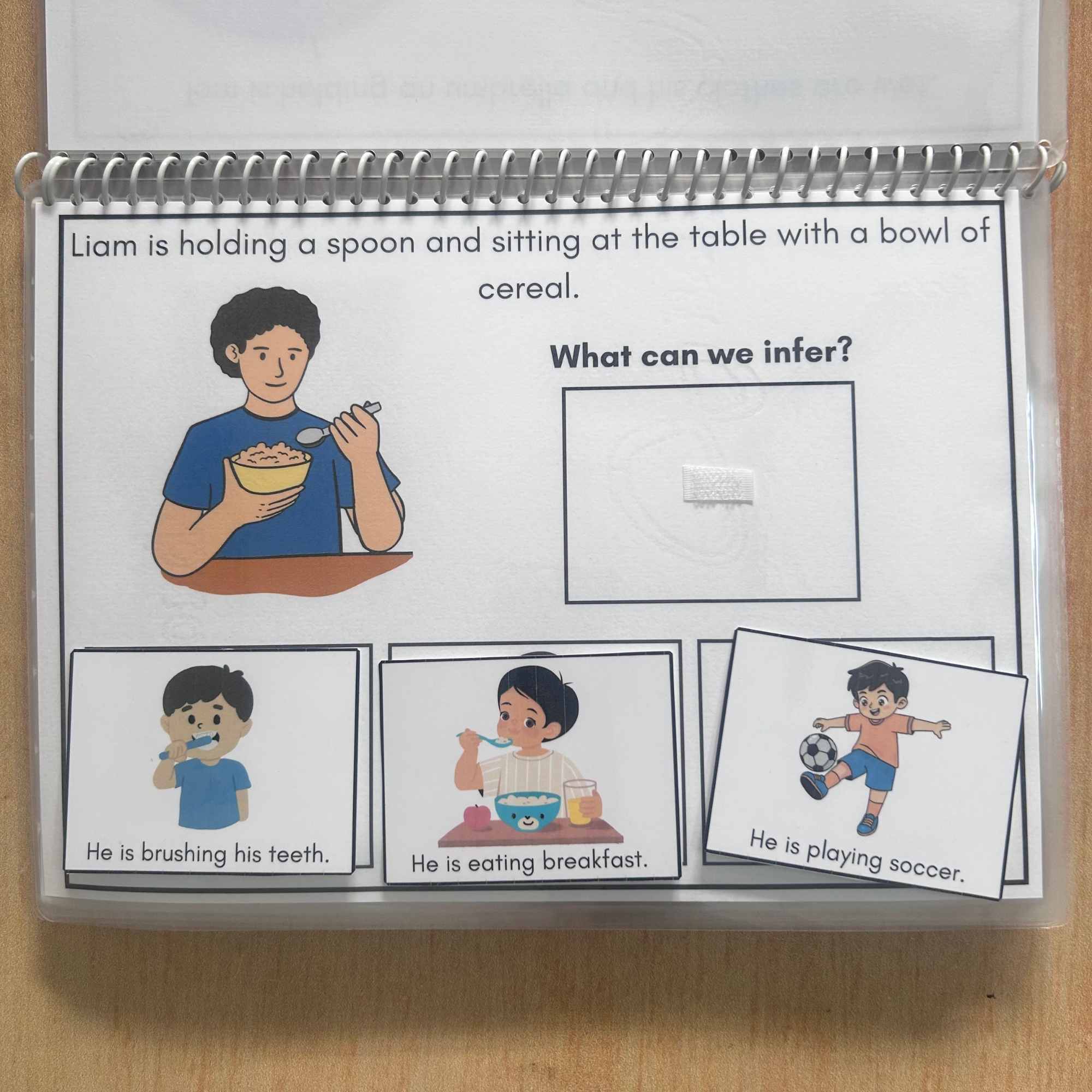 Each adapted page includes a clear visual scene and a simple sentence to help students practice inferencing skills. Students choose the correct answer from three visual choices and place or point to the correct response. This hands-on format makes learning interactive and easy to understand.