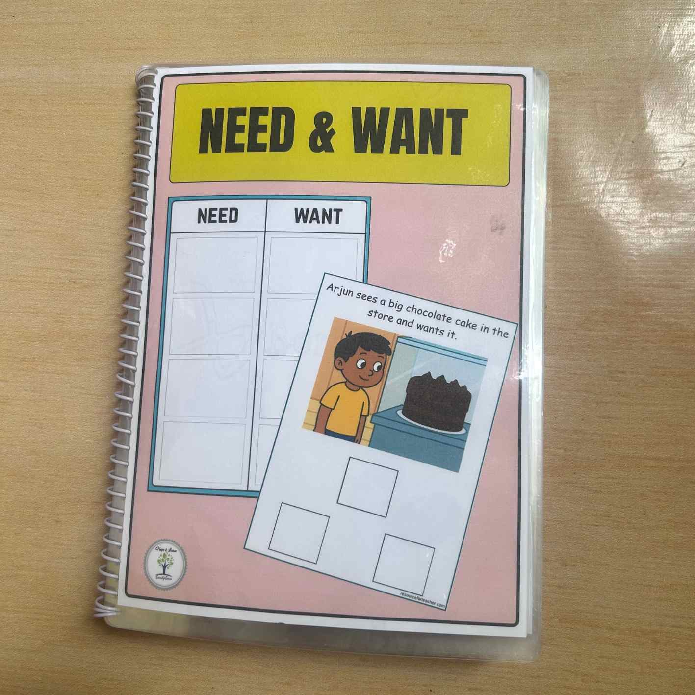 Each page features real-life scenarios and visual cards to help children make decisions and sort the items correctly. Students will read or listen to a simple scenario, then choose the correct “need” or “want” card to complete the activity.