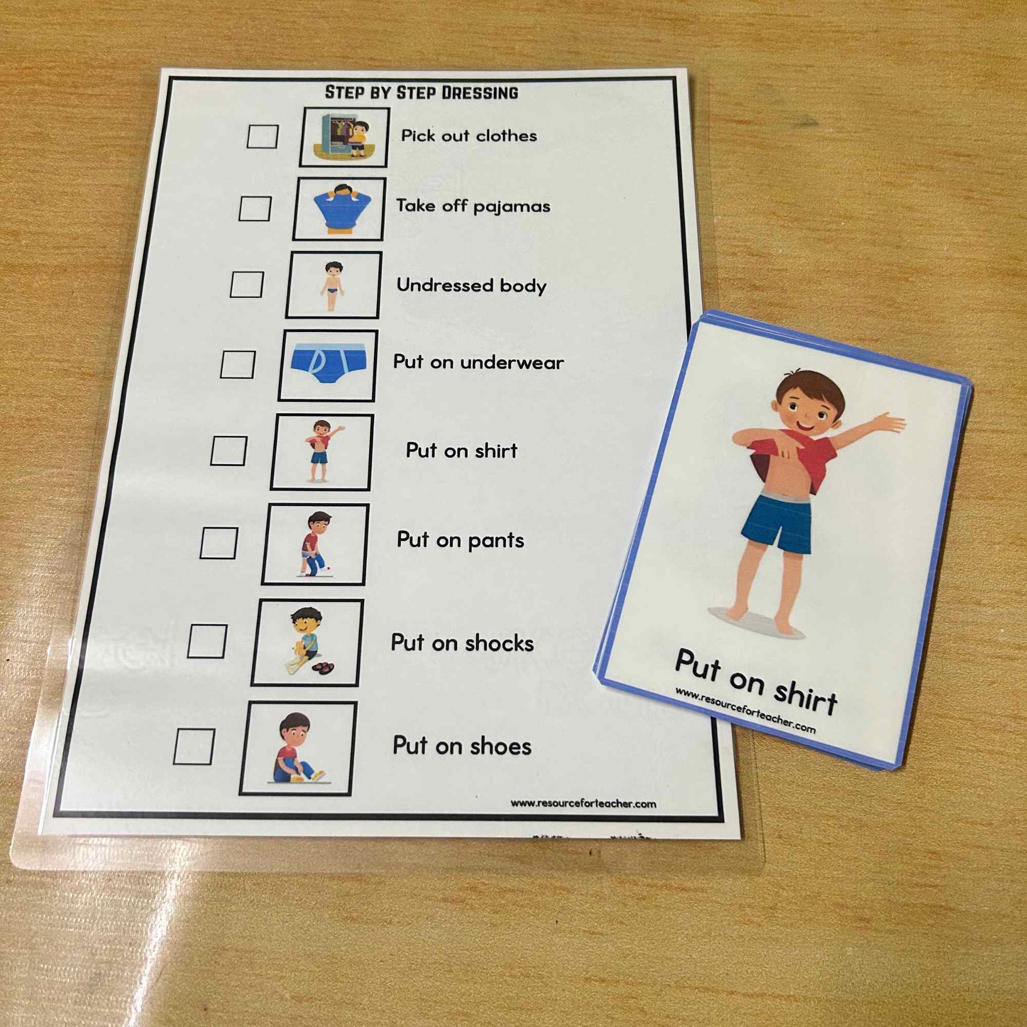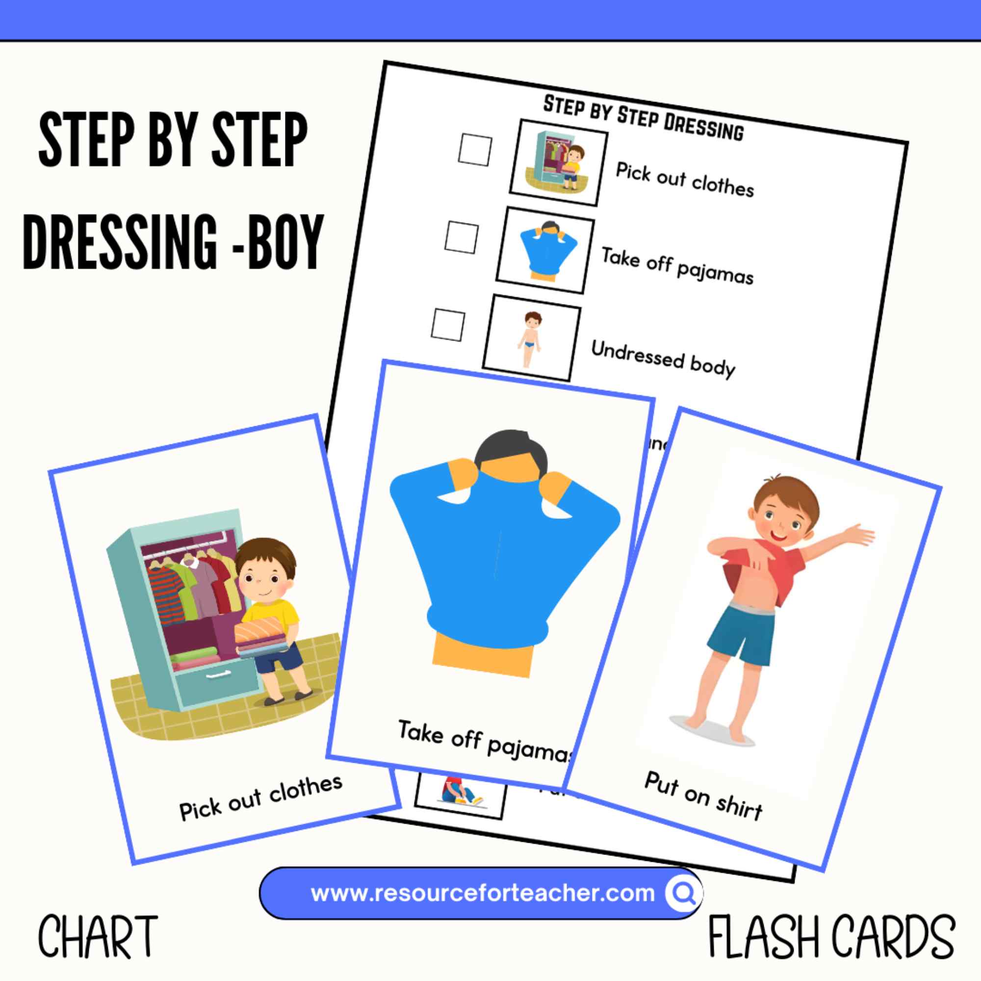 Equip special needs students with the confidence and independence they need to navigate the daily task of dressing with our “Steps of Dressing Boy” resource. Unlock their potential and foster greater self-reliance with this invaluable educational tool.