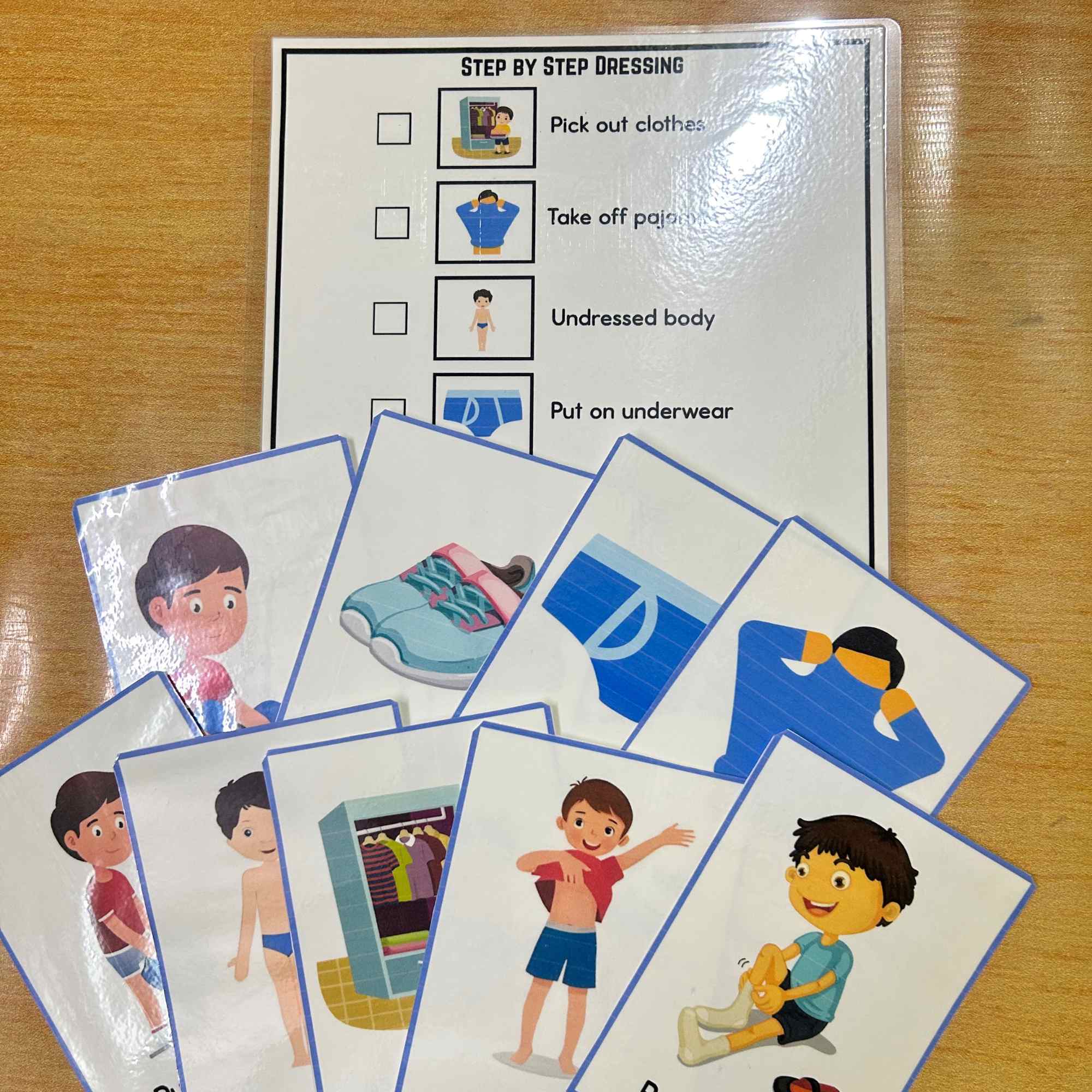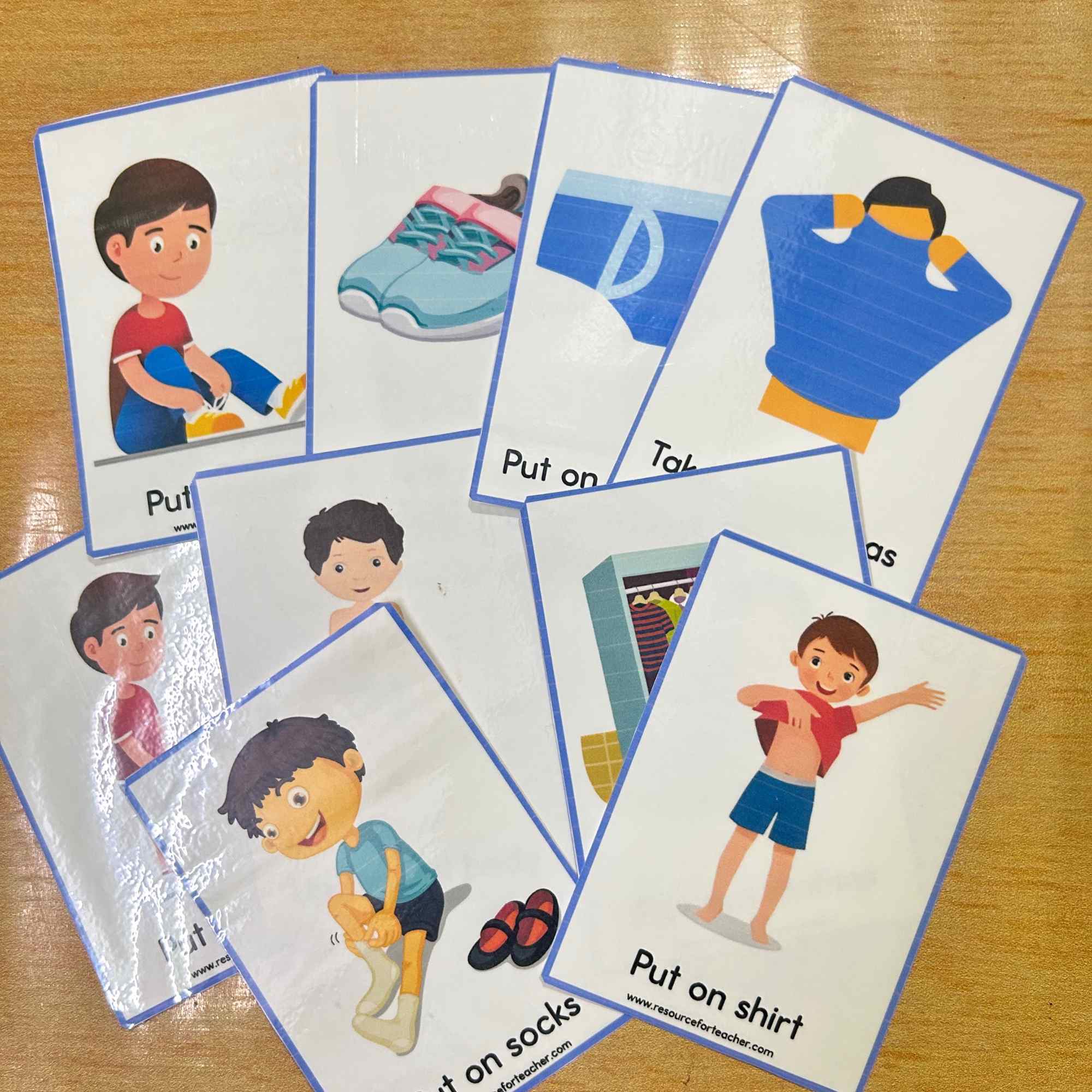 Each flashcard depicts a specific step in the dressing process, presented in a simple and easy-to-understand manner. From putting on socks to fastening buttons, every aspect of dressing is broken down into manageable tasks, enabling students to grasp the sequence effectively.