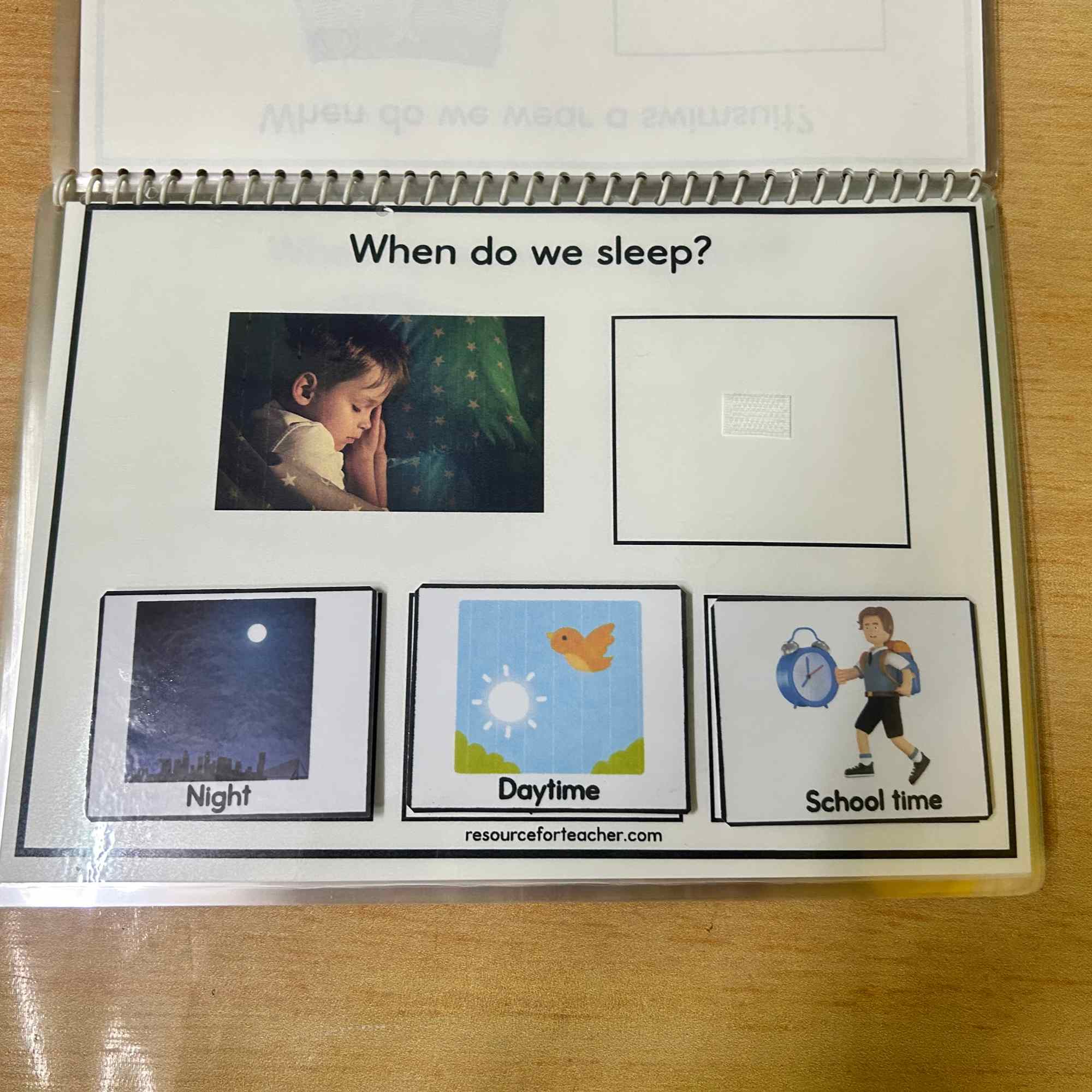 This When – WH Questions for Autism interactive adapted book is designed to help children on the autism spectrum and those with learning challenges develop their understanding of “when” questions. It features: